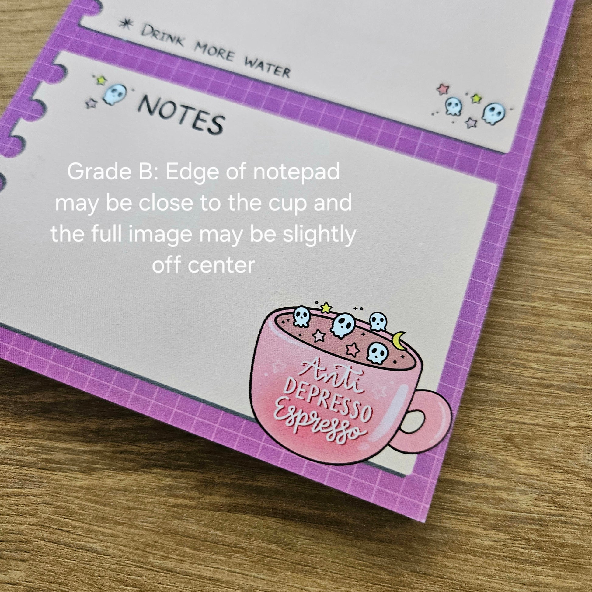 - Grade B notepads available due to minor defects such as scuff marks on first page, slightly bent corners, uneven glue on binding